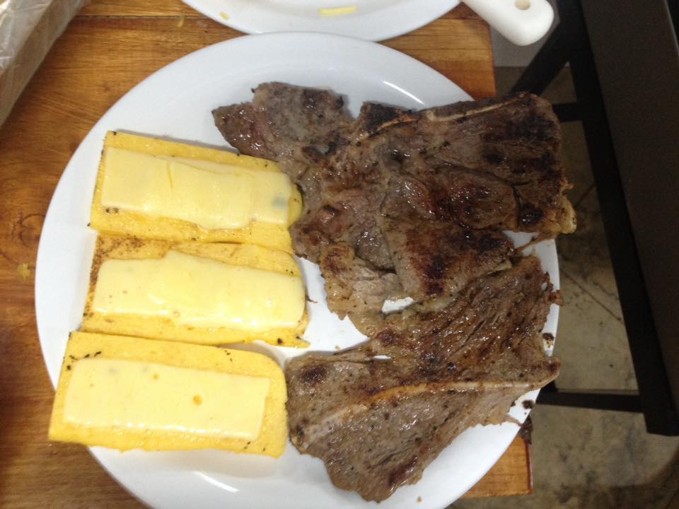 Almoço com polenta na chapa, chuleta, tilápia, saladas, acompanhamentos.
